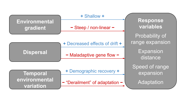 Theory has suggested that the shape of environmental gradients and the magnitude of dispersal play key roles in the probability of range expansion and the formation of stable range limits. However, we largely lack empirical tests of range limit theory. Furthermore, existing models do not account for many factors that we know to be common features of natural environments and systems, such as temporal environmental variation and heritable variation in dispersal. I use experimental evolution, genomic analyses, and novel models to