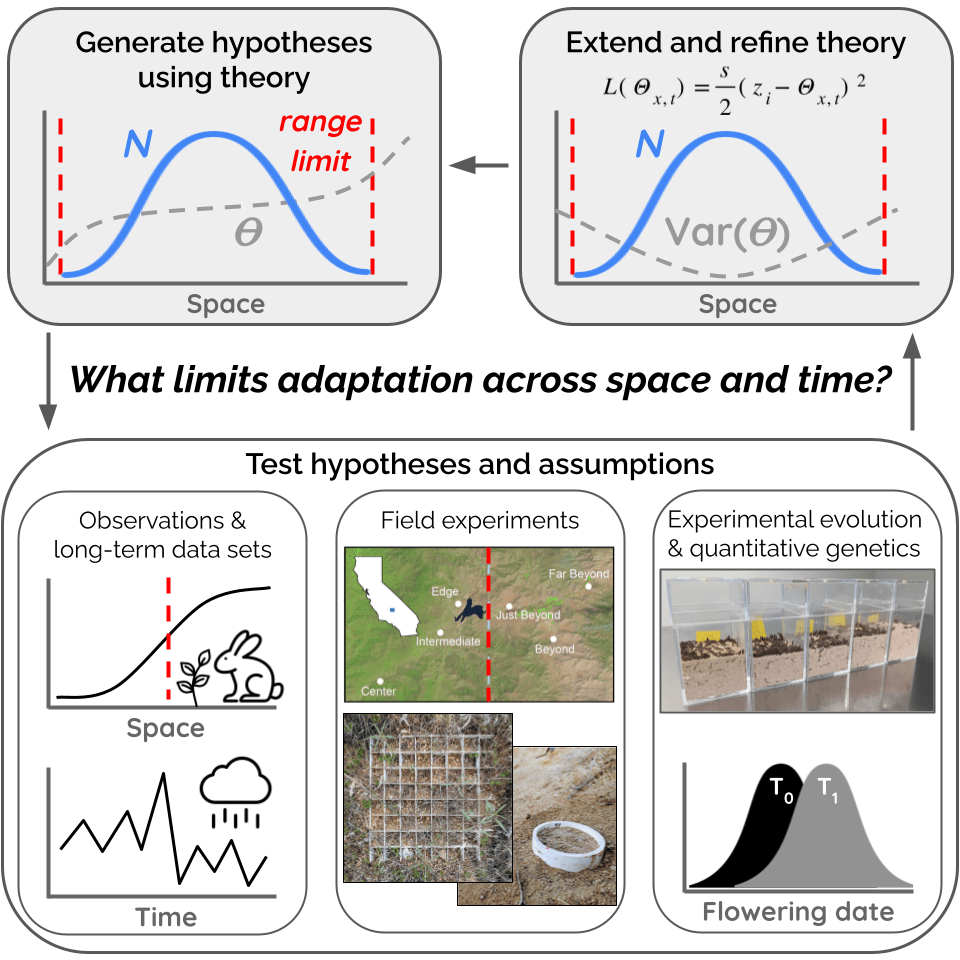 A species’ niche often manifests in space as the species’ geographic distribution. Thus species’ distributions are ecological patterns emerging largely from the evolutionary process of adaptation, with the limits of these distributions often reflecting the boundary between adaptation and maladaptation. But before we can assess why adaptation fails at a species’ range limit, we need to ask what environmental factors are actually constraining the species’ distribution — what is it about the environment beyond the range limit that prevents populations from establishing there? Surprisingly, it’s rare to have experimental tests of this question. Historically studies and models of species’ distributions have focused overwhelmingly on climatic variables, and species’ distribution models often assume purely climatic control on species’ ranges. However, most species are distributed over complex environmental gradients comprising changes in multiple biotic and abiotic variables. Transplant experiments, ideally combined with manipulations of putatively important environmental variables, are the most powerful method to test the relative influence of these variables on the location of the species’ range limit. In my dissertation, I used a variety of field and greenhouse experiments with the California native plant Clarkia xantiana ssp. xantiana (Onagraceae) to untangle complex environmental gradients and test key predictions from range limit theory, quantifying the relative influence of both biotic and abiotic factors on plant lifetime fitness inside and outside the subspecies’ geographic range limit.